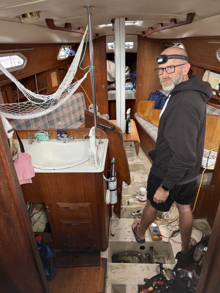 Reseat mainsail luff slug. Repair bow-light wiring insulation. Replace toilet intake vent loop. Track down freshwater pump cycling issue. Repair dodger stitching.